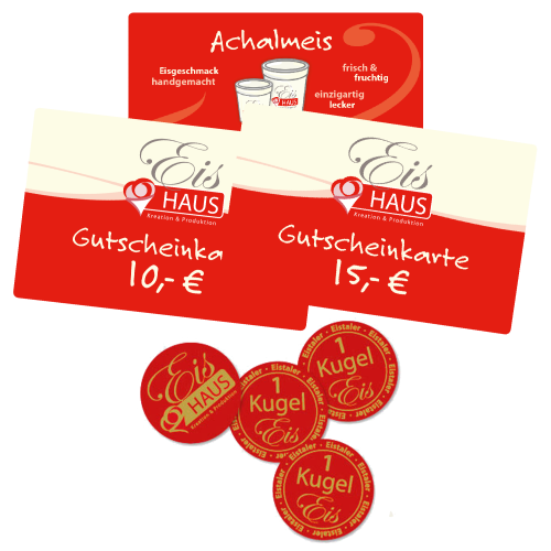 Außerdem gibt es unsere Gutscheinkarten für 10 € oder 15 €. Diese verschenkt man an Leute, die gerne Vorratsbecher kaufen, oder aber größere Mengen an offenem Eis!